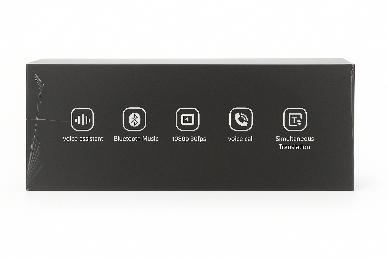 Modern and understated, these smart glasses feature a streamlined black frame with dark-tinted lenses for a clean, everyday look. A discreet built-in camera near the hinge blends seamlessly into the design, offering functionality without compromising style. The lightweight construction ensures comfortable wear, while the smooth matte finish adds a refined, tech-forward feel.